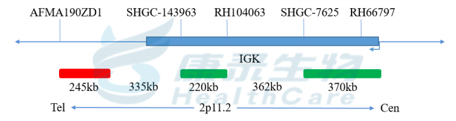 IGK基因5’端标记为绿色; IGK基因3’端标记为橘红色。