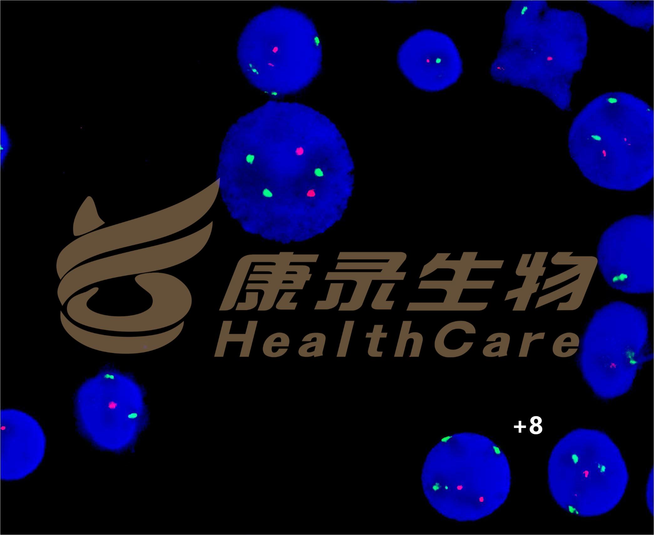 EGR1基因(5q31.2)标记为橘红色; D5S630基因位点(5p15.31-15.2)标记为绿色。 CSF1R基因(5q32)标记为橘红色; D5S630基因位点(5p15.31-15.2)标记为绿色。 D7S522基因位点(7q31.2)标记为橘红色; 7号染色体着丝粒(CEP7)标记为绿色。 D7S486基因位点(7q31.2)标记为橘红色; 7号染色体着丝粒(CEP7)标记为绿色。 D20S108基因位点(20q12)标记为橘红色; 8号染色体着丝粒(CEP8)标记为绿色。 Y染色体着长臂(CEPY)标记为橘红色; X染色体着丝粒(CEPX)标记为绿色。 X染色体着长臂(CEPX)标记为橘红色; Yq12段标记为绿色。