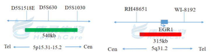 EGR1基因(5q31)标记为橘红色; D5S630位点标记为绿色。