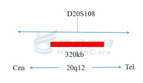 D20S108基因位点(20q12)标记为橘红色。 8号染色体着丝粒(CEP8)标记为绿色。
