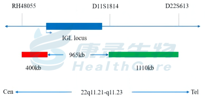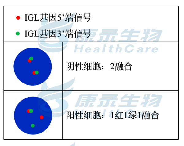 辅助诊断MYC::IGL融合的伯基特淋巴瘤; 伯基特(Burkitt)淋巴瘤(BL)是高度侵袭性的非霍奇金淋巴瘤(NHL),常发生在结外部位或表现为急性白血病。BL恶性程度极高,细胞倍增周期很短,生长迅速,若不及时治疗,患者可在数个月内死亡; 分子遗传学特点为MYC基因与IGH或IGK或IGL发生融合,此断裂探针用于判断是否发生IGL断裂;