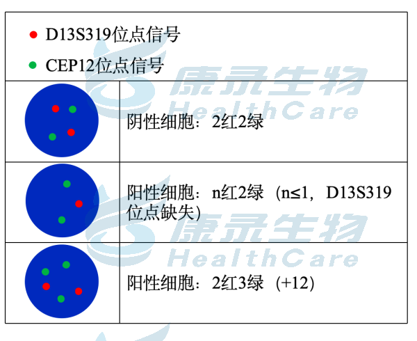 RB1基因(13q14.2)标记为橘红色; ATM基因(11q22.3)标记为绿色。 p53基因(17p13.1)标记为橘红色; 17号染色体着丝粒(CEP17)标记为绿色。 D13S319基因位点(13q14.2)标记为橘红色; 12号染色体着丝粒(CEP12)标记为绿色。