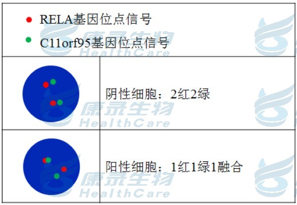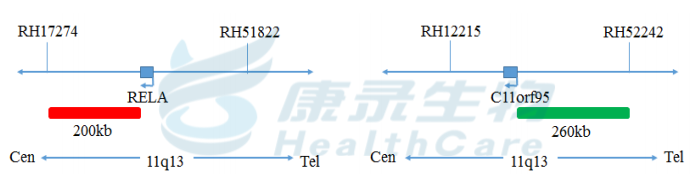RELA与伙伴基因C11orf95在基因组中仅距1M多,挨得很近,本公司C11orf95/RELA基因融合探针为全球唯一可识别C11orf95-RELA融合基因的探针。