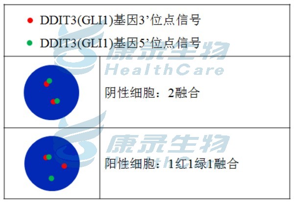 大于95%的黏液样脂肪肉瘤有特征性改变t(12;16)(q13;p11),导致产生DDIT3-FUS融合基因。DDIT3和MDM2在基因组中挨得很近,仅相距12M,如果检测DDIT3断裂为阴性但呈单色/双色扩增时应怀疑MDM2扩增,需用MDM2探针确认。