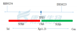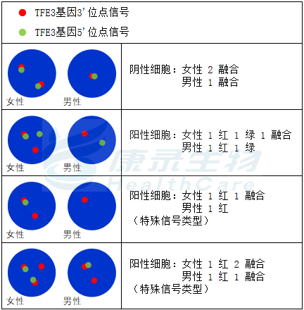 TFE3基因3’端标记为橘红色; TFE3基因5’端标记为绿色。