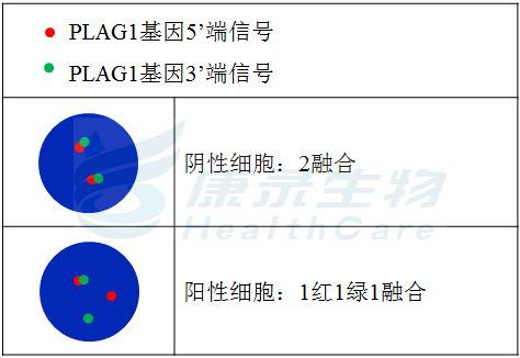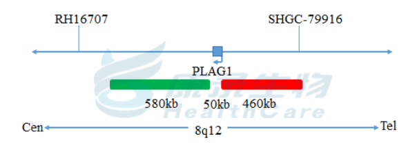 PLAG1基因5’端标记为橘红色; PLAG1基因3’端标记为绿色。