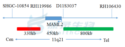 MAML2基因3’端标记为橘红色; MAML2基因5’端标记为绿色。