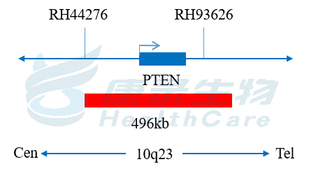 PTEN基因(10p23)标记为橘红色,长度为496kb; 10号染色体着丝粒(CEP10)标记为绿色。