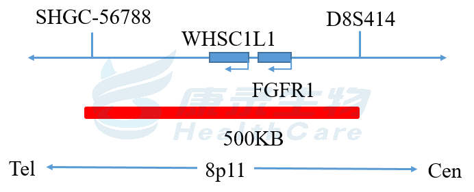 FGFR1基因(8p11)标记为橘红色; 8号染色体着丝粒(CEP8)标记为绿色。