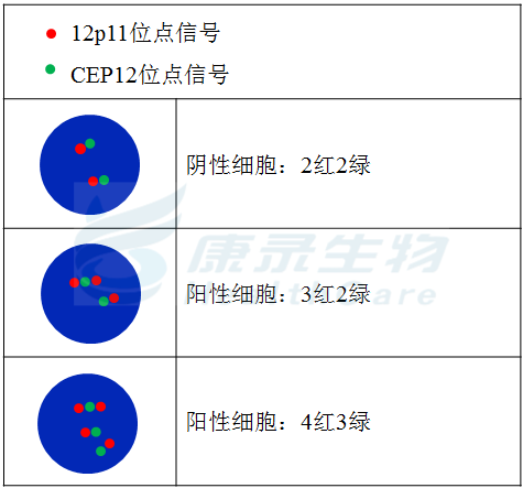 12p11段标记为橘红色; 12号染色体着丝粒(CEP12)标记为绿色。