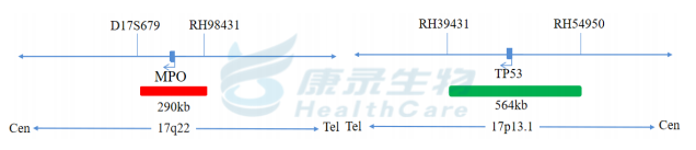 MPO基因(17q22)标记为橘红色; TP53基因(17p13.1)标记为绿色。
