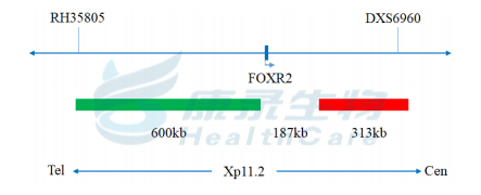 FOXR2基因3’端标记为橘红色; FOXR2基因5’端标记为绿色。