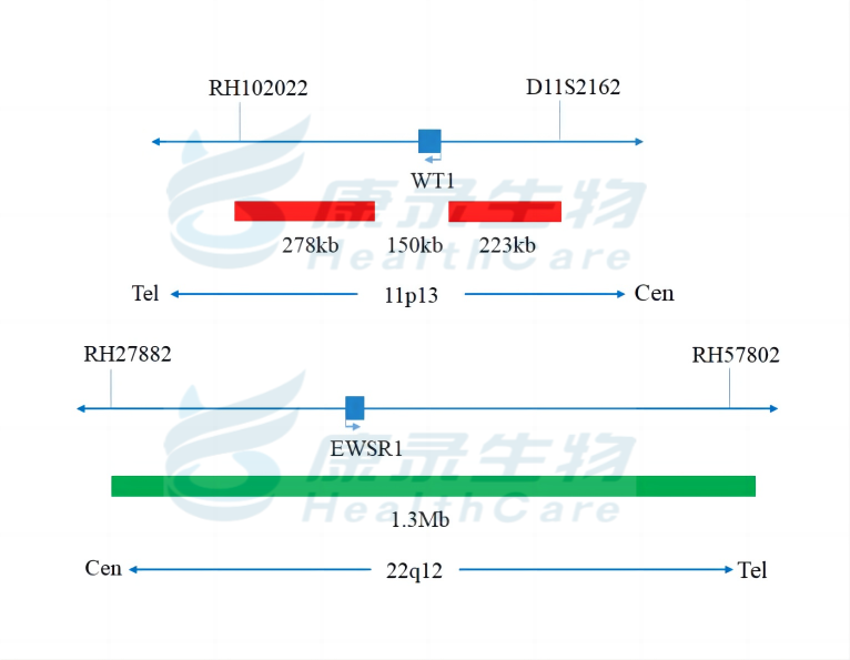WT1基因(11p13)标记为橘红色; EWSR1基因(22q12)标记为绿色。