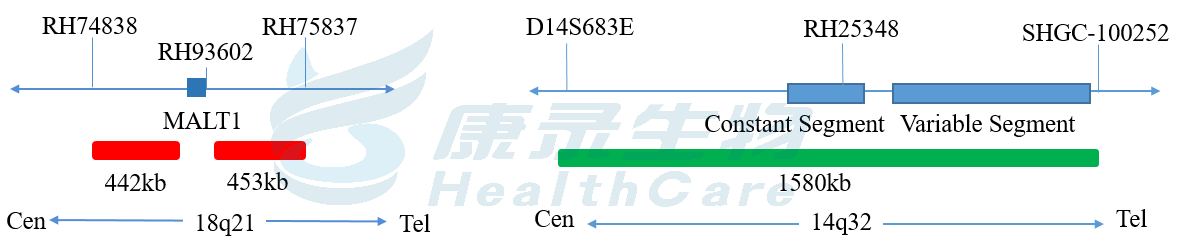 MALT1基因(18q21)标记为橘红色,总长度为895kb; IGH基因(14q32)标记为绿色,长度为1580kb。