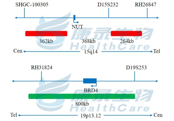 NUT中线癌是一种少见的高侵袭性的恶性肿瘤,任何年龄均可发生,好发于儿童、青年纵膈及其他中线器官的罕见肿瘤,组织起源不明,具有侵袭性。 BRD4/NUT融合t(15;19)(q13;p13.1)是分化极差的中线癌的标志物,与预后差相关,此为融合基因检测探针。