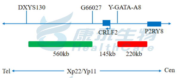 CRLF2基因5’端标记为橘红色;CRLF2基因3’端标记为绿色。