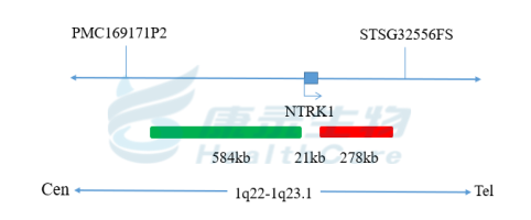 NTRK1基因3’端标记为橘红色; NTRK1基因5’端标记为绿色。