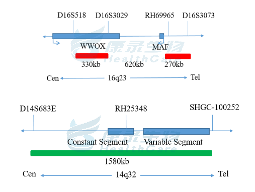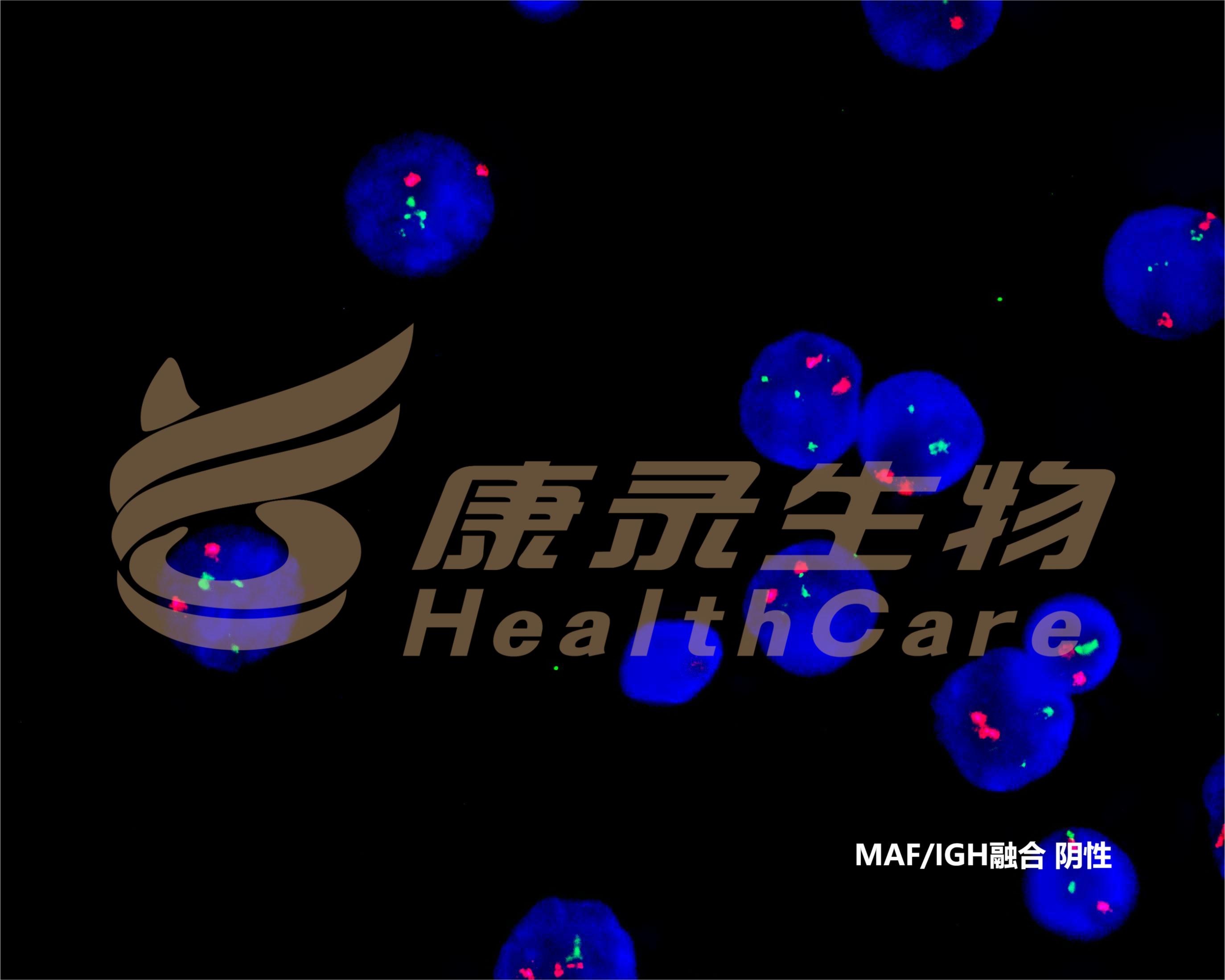 MAF基因(16q23)标记为橘红色; IGH基因(14q32)标记为绿色。