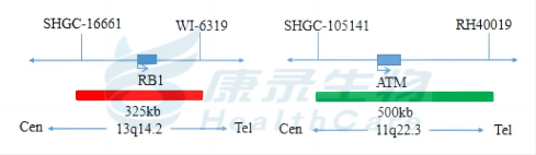 RB1基因(13q14.2)标记为橘红色; ATM基因(11q22.3)标记为绿色。