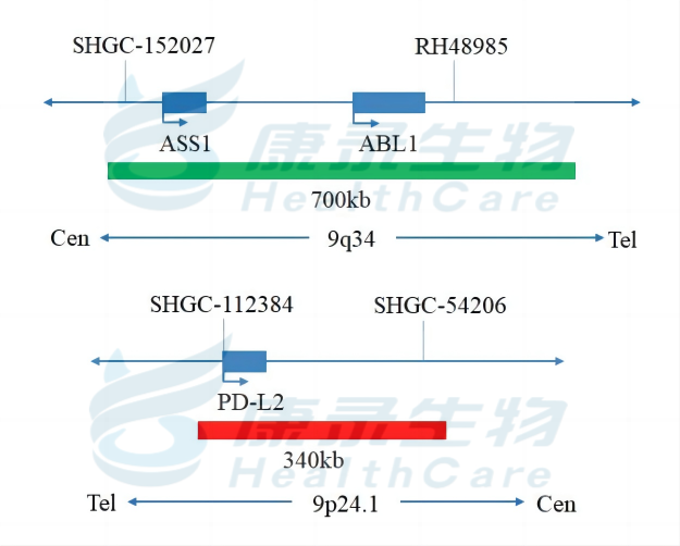 PD-L2基因(9p24)标记为橘红色; ABL1基因(9q34)标记为绿色。