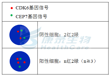 CDK6基因(7q21)标记为橘红色; 7号染色体着丝粒(CEP7)标记为绿色。