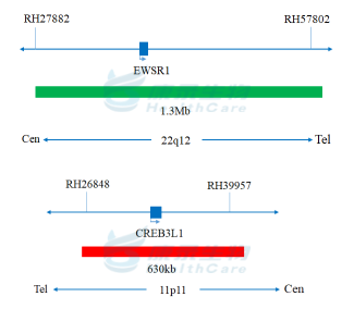 CREB3L1基因(20q13.2)标记为橘红色; EWSR1基因(22q12)标记为绿色。