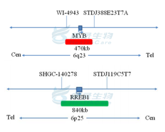 MYB基因(6q23)标记为橘红色; RREB1基因(6p25)标记为绿色。