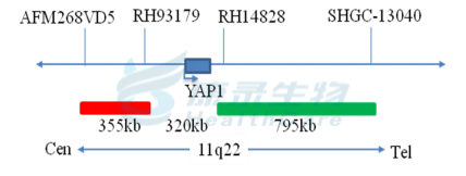 YAP1基因5'端标记为橘红色; YAP1基因3'端标记为绿色。