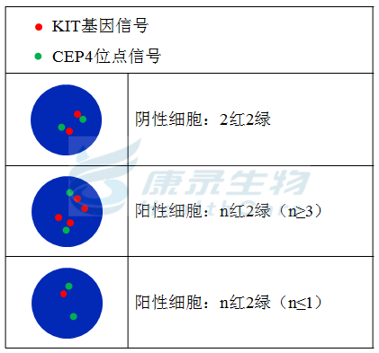 KIT橘红色探针;CEP4绿色探针。