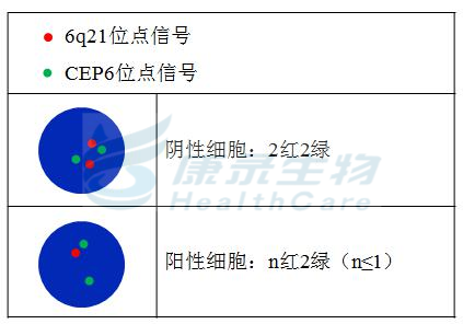 6q21(SEC63)橘红色探针;CEP6绿色探针。