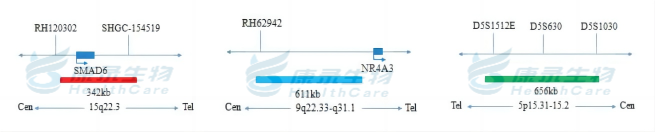 15q22(SMAD6)橘红色探针; 5p15(D5S630)绿色探针; 9q22青色探针。