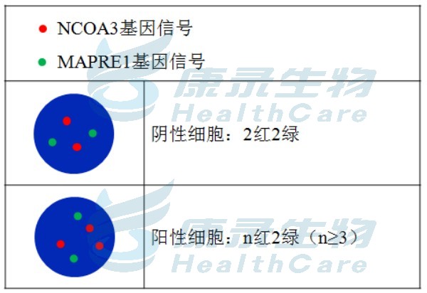 NCOA3 基因橘红色探针; MAPRE1绿色探针。