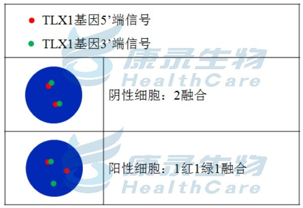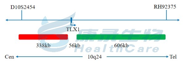TLX1 基因5'端标记为橘红色; TLX1 基因3'端标记为绿色。