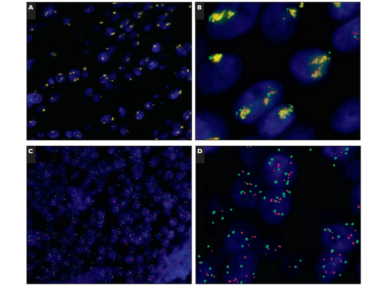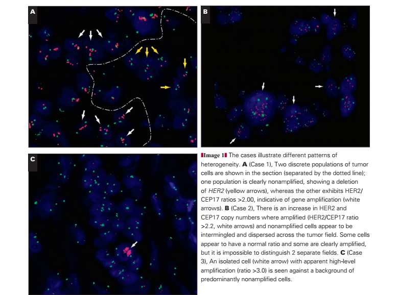HER2 gene amplification has been recognized for many years as a poor prognostic indicator in early breast cancer. More recently, with the introduction of HER2-targeted therapies, in particular trastuzumab (Herceptin), HER2 status has become a critical component in selecting the best treatment options in early and advanced breast cancer.1–3 The use of fluorescent in situ hybridization (FISH) and other in situ hybridization (ISH)-based methods, eg, chromogenic and silver ISH, has become widely accepted as the “gold standard” for determining HER2 amplification status and, in most cases, provides a clear answer as to whether a case is amplified; however, there are small subsets of “unusual” cases that do not conform to conventional diagnostic guidelines and reporting procedures and provide significant interpretive difficulties.