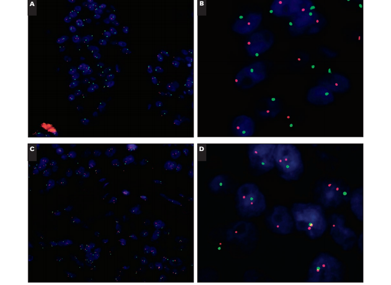In this case (Image 1C), there are isolated cells with apparent high-level (ratio >3.0) amplification in the tumor against a background of predominantly nonamplified cells. Caution should be applied to ensure that the signal in apparently amplified cells is genuine and does not reflect a processing artifact. Some artifacts may appear to mimic true signals but fluoresce across multiple wavelengths (ie, autofluorescence). Therefore, a check that these signals do not appear under 4′,6-diamidino-2-phenylindole, green, or aqua filters should be performed before they are scored. If these signals are genuine, they should be counted.