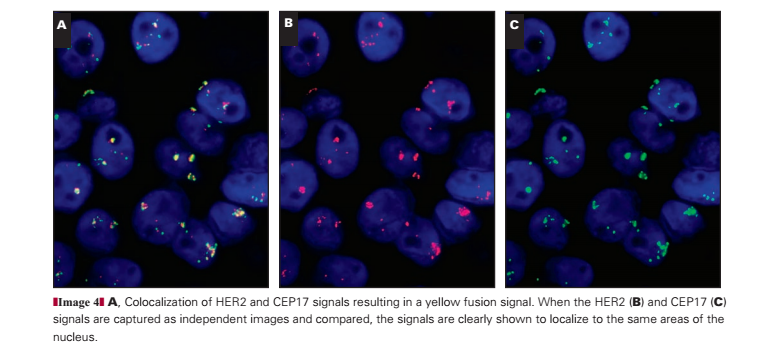 Although rare, coamplification of HER2/CEP17 is a topic of significant debate in the diagnostic community. Only 2 (0.1%) of 1,787 cases showed “colocalization” of the HER2 and CEP17 signals in the current audit Image 4. Colocalization of CEP17 and HER2 is observed when the HER2 (red; Image 4B) and CEP17 (green; Image 4C) FISH signals overlap to produce a yellow “merged” signal (Image 4A). This is a rare occurrence, thought to reflect coamplification of the CEP17/HER2 signals. However, a larger number of cases, 22 (1.2%), showed high copy numbers of HER2 (≥6 copies per cell) with duplication of CEP17 signals such that the overall HER2/CEP17 ratio did not exceed 2.0. The interpretation of these cases remains difficult with little evidence to support diagnosis; at present, we have interpreted balanced duplication of HER2/CEP17 (≥6 signals for HER2/CEP17 with ratios near 1) as evidence of coamplification.