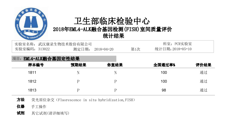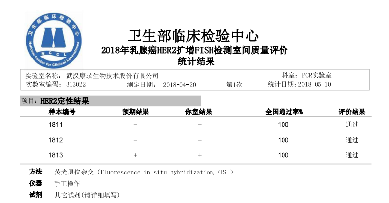 2018年5月10日,威廉希尔500欧洲指数(以下简称“威廉希尔500欧洲指数”),再一次以满分成绩顺利通过国家卫生部临床检验中心(NCCL)测评,包括两个项目:乳腺癌HER2扩增FISH检测、EML4-ALK融合基因检测。
