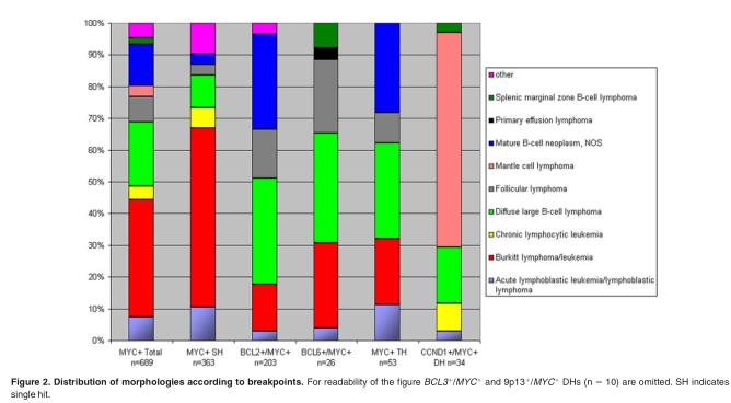 FISH analysis only informs on the targets for which probes are used.To get a better idea about the nature of all DH lymphomas and to search for other types than BCL2 + /MYC + and BCL6 + /MYC+ lymphomas, we explored the Mitelman Database of Chromosome Aberrations in Cancer, edition February 2010 (see supplemental Tables 1-2, available on the Blood Web site; see the Supplemental Materials link at the top of the online article). 8 This large publicly available database contains virtually all published cytogenetic data on a wide variety of malignancies, including B-cell lymphomas. We selected reports with a MYC breakpoint published after the Revised European-American Lymphoma classification to be confident about the classification of the cases. 9 We realize that this has introduced a certain bias toward DH lymphomas, because several of these publications specifically addressed this phenomenon. 10-15 We included only mature B-cell malignancies (see supplemental data for strategies and sources). Plasma cell neoplasms were excluded because they represent a different disease and are characterized by genetic aberrations different from those seen in aggressive B-cell lymphomas. Translocations in myelomas involve both primary translocations(CCND1,CCND3,FGFR3 and MMSET, c-MAF, and MAFB) and secondary translocations involving MYC. 16,17 DHs involving these genes and also combinations thereof were frequently seen in the Mitelman database (5%-25%; data not shown). 8 Of note, a selection bias may have occurred because myelomas with MYC translocations probably have a higher success rate for culturing and karyotyping. Plasmablastic lymphomas were also excluded. A recent report identified MYC rearrangements in 49% of these lymphomas but no concomitant rearrangement of BCL2, BCL6 or PAX5.