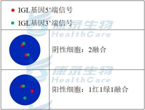 分子遗传学特点为MYC基因与IGH或IGK或IGL发生融合,此断裂探针用于判断是否发生IGL断裂