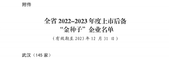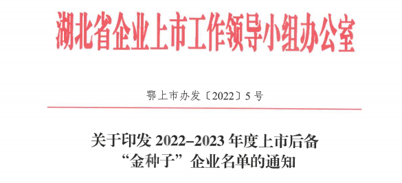 2022年5月27日,湖北省企业上市工作领导小组办公室召开湖北省2022-2023年度上市后备“金种子”企业发布会,会上公布了2022-2023年度省级上市后备“金种子”企业名单和《“金种子”企业上市支持政策清单》,全省共332家企业入选,威廉希尔500欧洲指数位列名单之中,成为湖北省上市后备“金种子”企业。